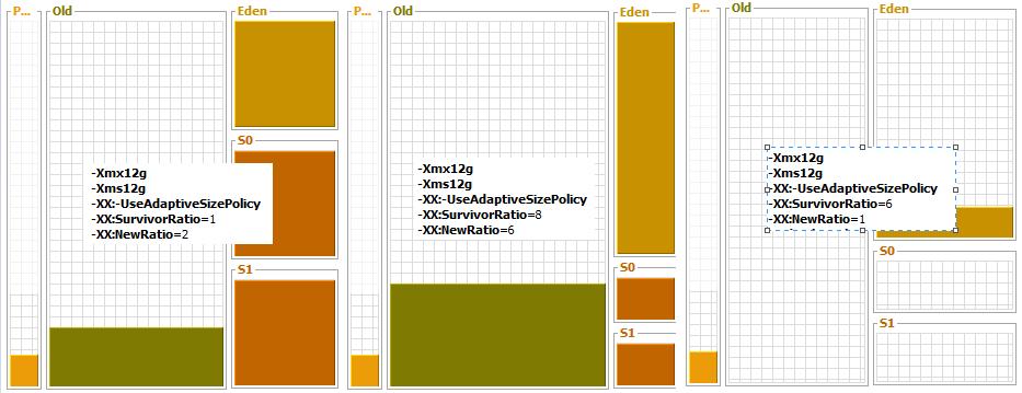 Note: In practice one would evaluate the required size of NewSpace and specify it with -XX:NewSize=X -XX:MaxNewSize=X absolutely. This way changing -Xmx will affect OldSpace size only and will not mess up absolute Survivor Space sizes by applying ratios.