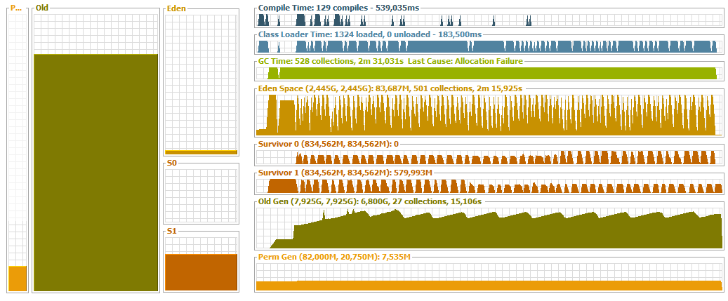 Each of the spikes represents a full GC with a duration of ~15 seconds ! During the full GC, the program is stopped. One can see, that the Garbage Collecor has some automatic calibration. Initially it did a pretty good job, but after first GC things get really bad.